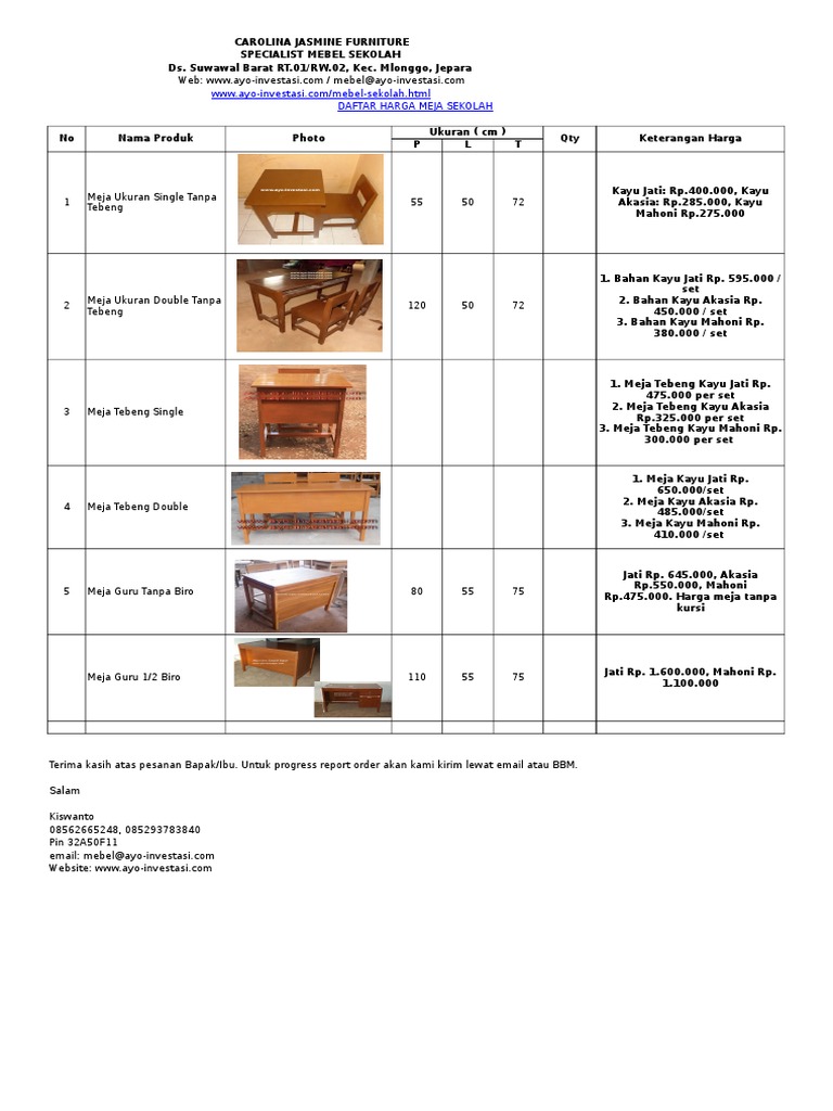 Harga meja tanpa kursi 0 ongkos kirim via truck expedisi ke jakarta total order dan ongkos kirim down payment 50% terima kasih atas pesanan bapak/ibu. Kursi siswa dan meja siswa b. Disini kami distributor penjual meja kursi siswa harga grosir menjual barang dari produsen secara langsung. Harga meja guru atau meja setengah biro jati lengkap dengan. Ada banyak pilihan desain yang unik dan lucu tentunya. Aksesoris meja seperiti sarung meja di gunakan untuk menutupi meja dan meja terlihat lebih rapi dan juga bisa. Kami sudah banyak mengirim kursi model ini ke berbagai kota baik di jawa maupun luar jawa. Hemat anggaran anda dengan potongan harga yang tersedia di setiap pesanan. Melayani sekolah wasta atau negeri. Menawarkan kepada anda sebuah produk meja guru dengan harga terjangkau. Dimasa sekarang ini perkembangan dunia cafe dan restoran selain menawarkan harga yang relatif murah, hampir semua cafe menggunakan kursi serta meja pilihlah bahan kursi meja yang awet dan tahan lama serta mudah dalam perawatan seperti. Download now mebeler murid berkualitas harga terjangkau. Salam kiswanto 08562665248, 085293783840 pin 32a50f11 email.